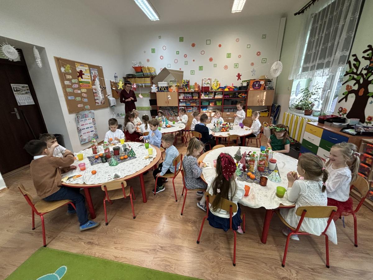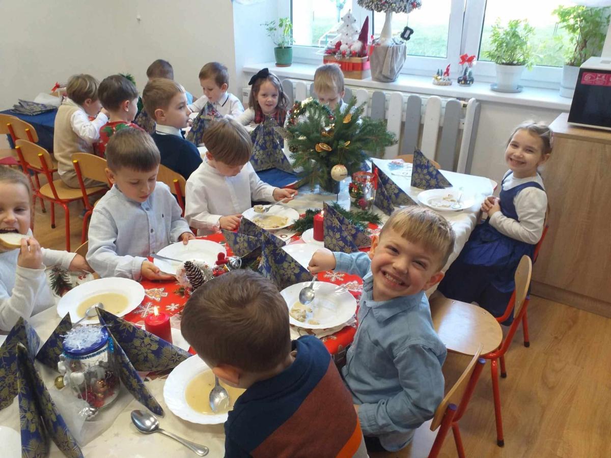 Po jasełkach odbyła się przedszkolna Wigilia. Przy wspólnym stole, w ciepłej i rodzinnej atmosferze, dzieci składały sobie życzenia, dzieliły się opłatkiem oraz wspólnie kolędowały. Był to wyjątkowy czas pełen uśmiechu, życzliwości i wzajemnej bliskości.