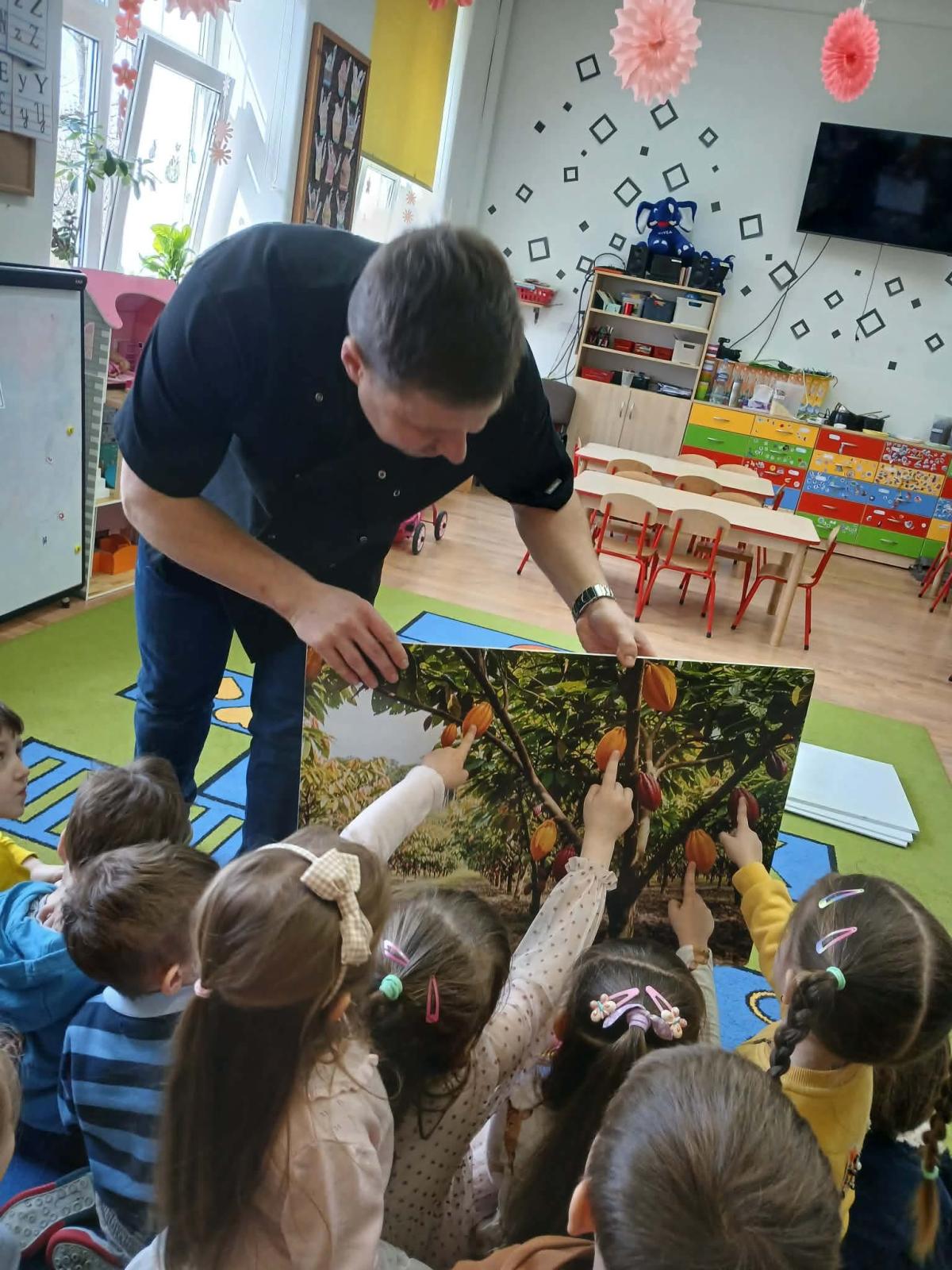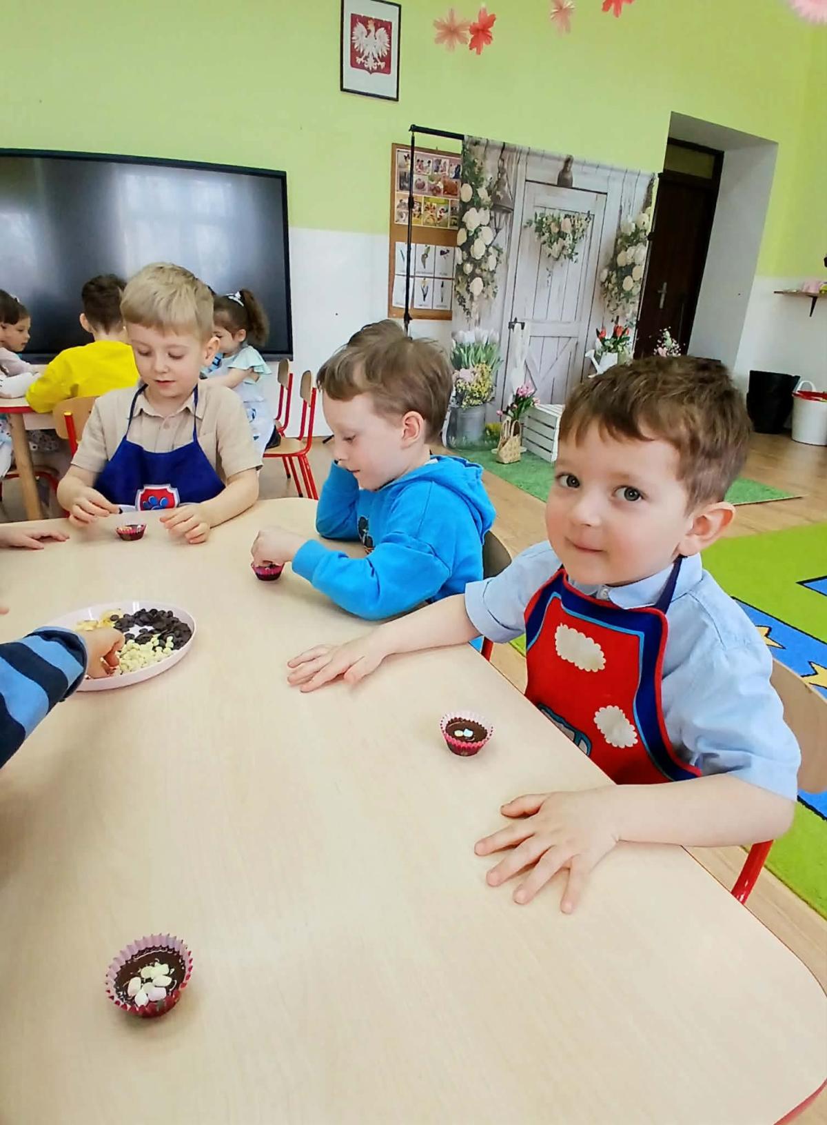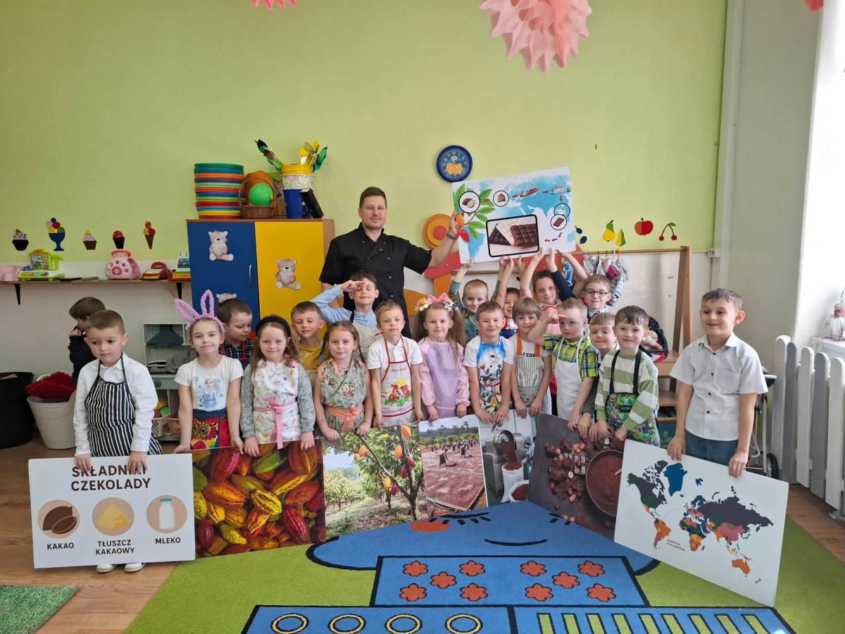 Warsztaty czekoladowe były dla naszych przedszkolaków wyjątkowym i bardzo radosnym sposobem na powitanie wiosny. Dzieci z ogromnym zainteresowaniem poznawały proces powstawania czekolady – od ziaren kakaowca aż po gotowy, słodki przysmak. Największą frajdę sprawiła jednak część praktyczna, podczas której każdy mógł stworzyć własne czekoladowe babeczki. Kreatywność i zaangażowanie dzieci były niesamowite, a efekty ich pracy – nie tylko piękne, ale i pyszne!