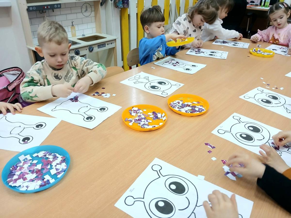 Dzień Kosmosu w naszej grupie maluszków był pełen radości i odkrywania tajemnic wszechświata. Dzieci poznały planety, oglądały ilustracje rakiet i astronautów oraz brały udział w zabawach ruchowych „w kosmosie”. Wspólnie wykonaliśmy prace plastyczne przedstawiające gwiazdy i galaktyki. To był dzień pełen wyobraźni, ciekawości i świetnej zabawy!